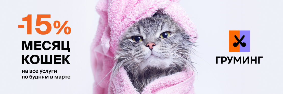 * Скидка 15% действует на все услуги груминга для кошек в будние дни и не суммируется с действующими акциями в Салонах, кроме Льготной скидки 7% на определенные категорий покупателей.